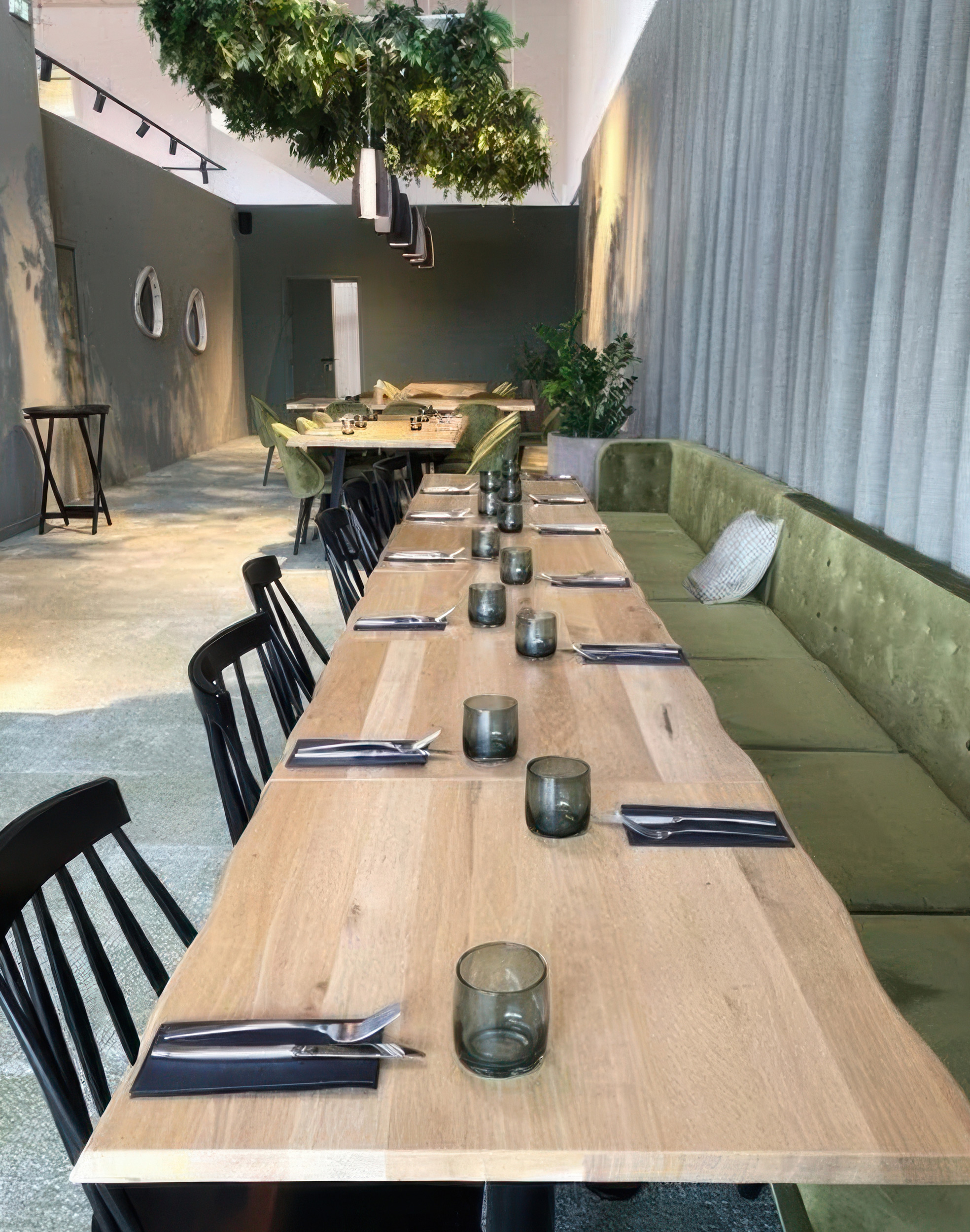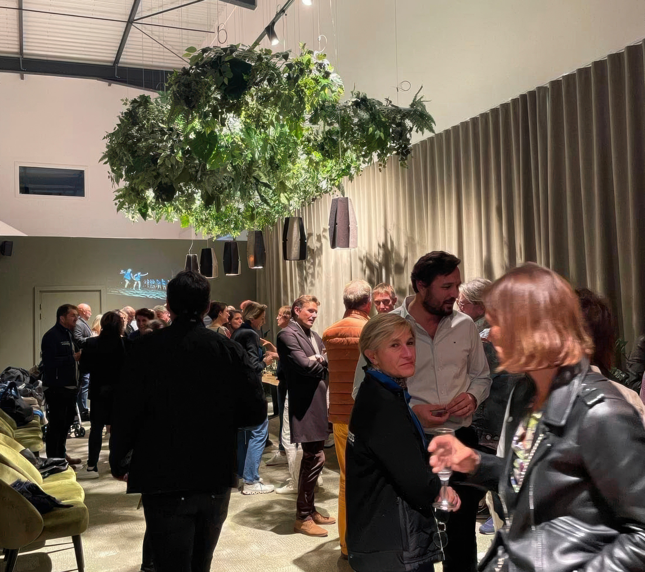 Installation d’une grille végétalisée pour décorer l’espace et contre balancer le volume lié à la hauteur sous plafond.